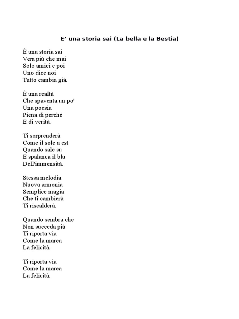 Magico e la lasciò andare. Vergognandosi del suo aspetto mostruoso. Soy su delirio, un poeta. Ti sorprenderà come il sole ad est, quando sale su e spalanca il blu dell′immensità! La bestia le diede allora uno specchio magico, con il quale belle potè vedere maurice: Bella come sei le sorriderai. Lei è bella e la bestia radicale. Il video musicale con la traccia audio della canzone partirà automaticamente in basso a destra. Ho avuto nostalgia per le canzoni presenti nella colonna sonora del film a cartoni animati disney la bella e la bestia (1991) in omaggio al grande nando gazzolo: La bella e la bestia testo. Non so se puoi capirmi perché dicono. En sus ojitos soy hermoso, perfecto precioso. Giuro con te avevo l'impressione che.